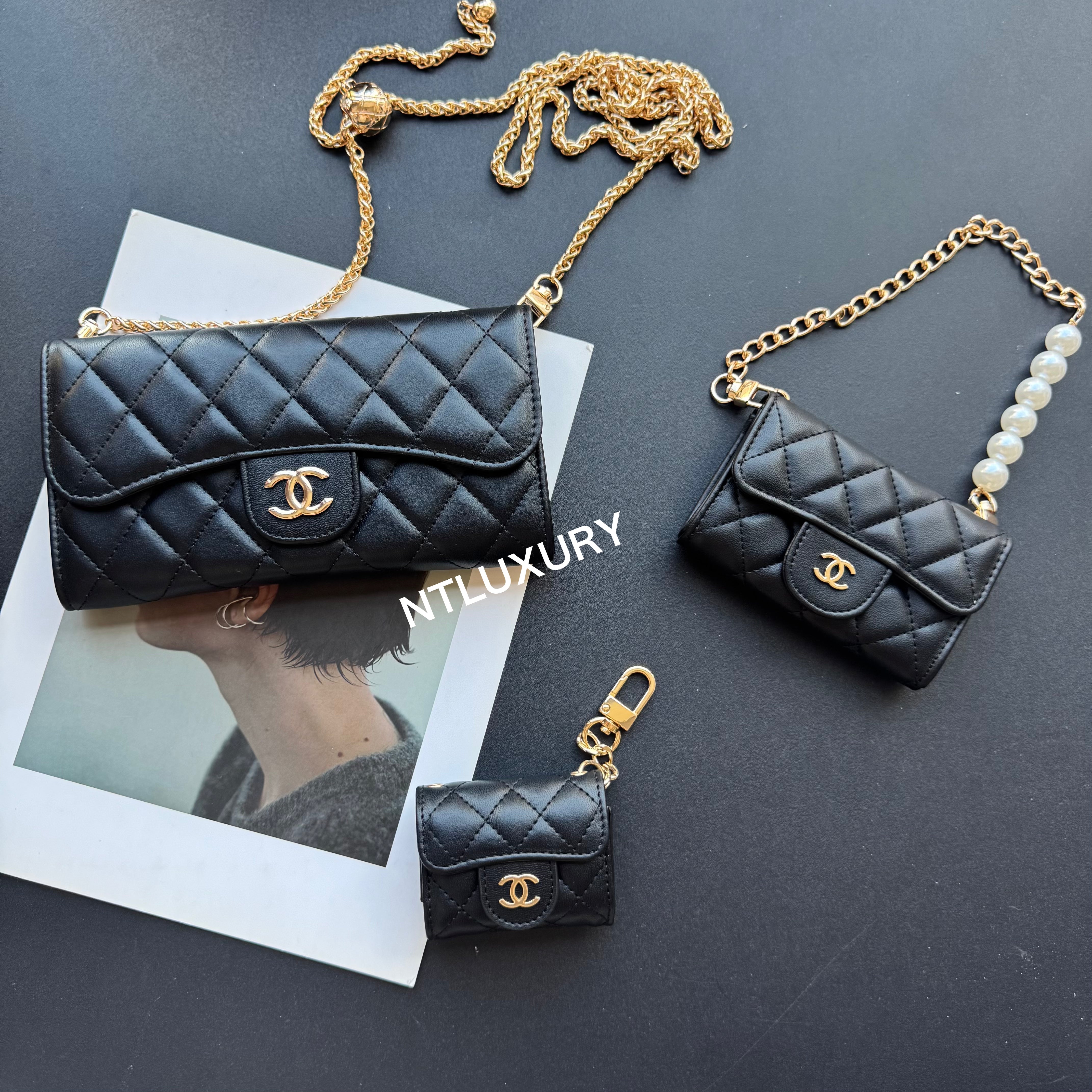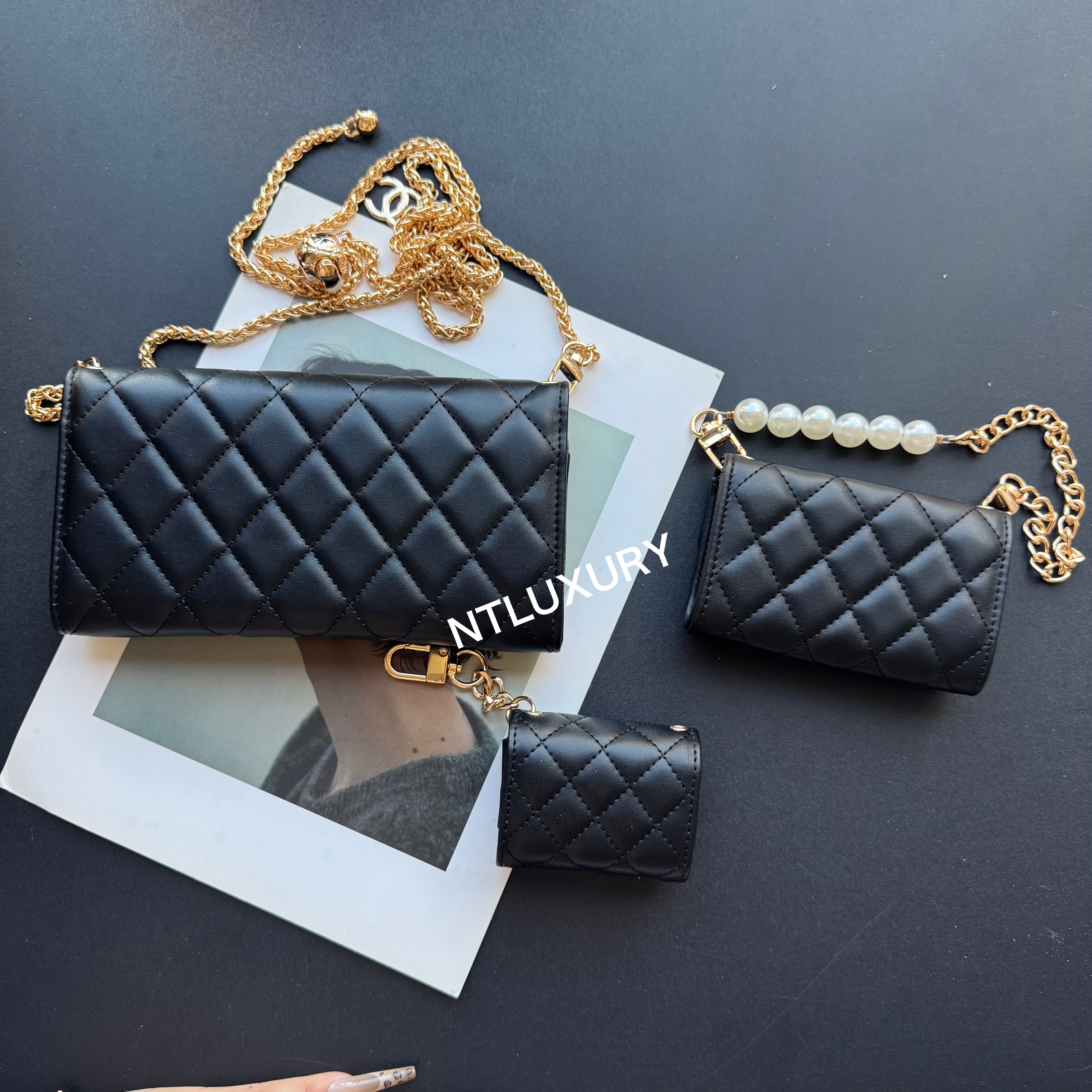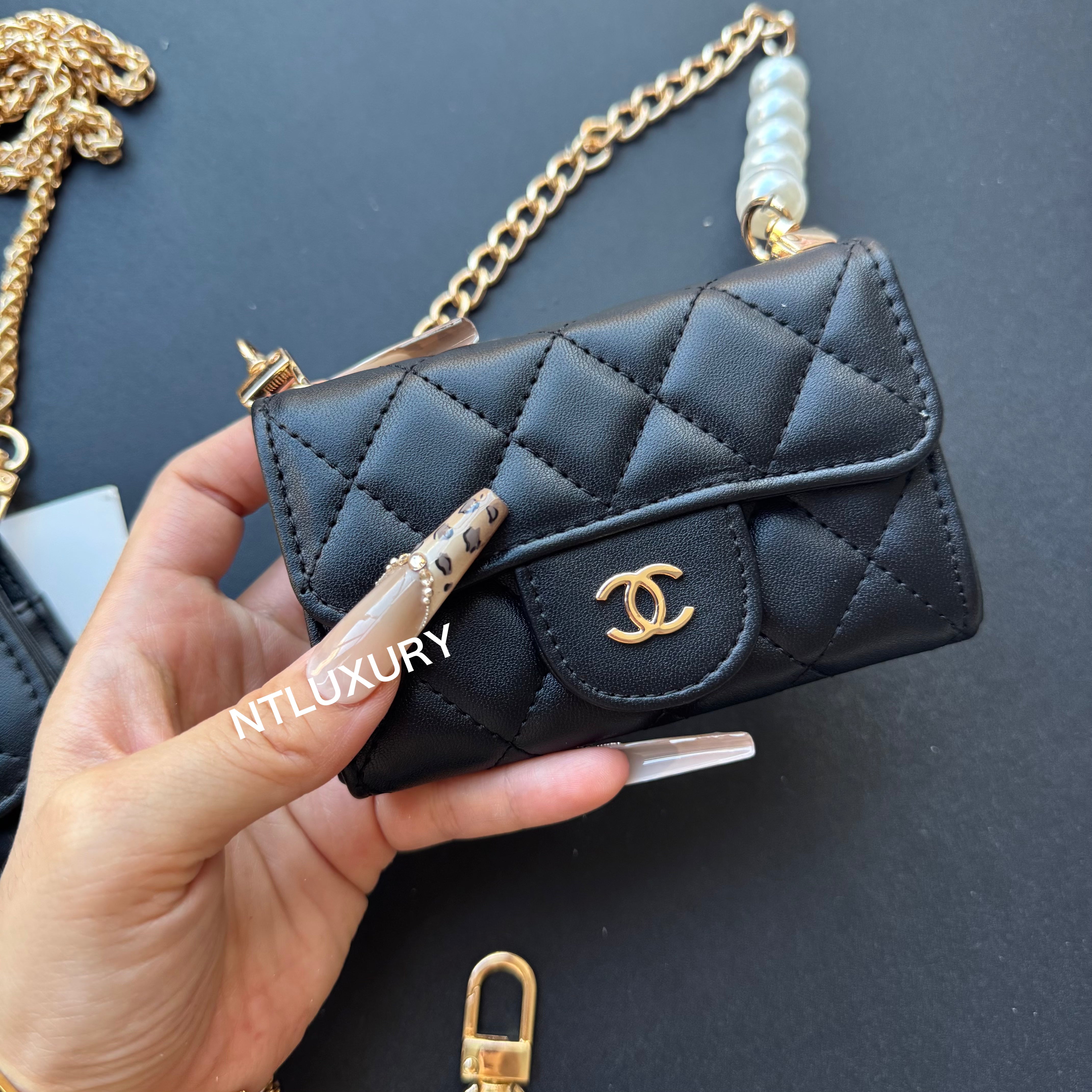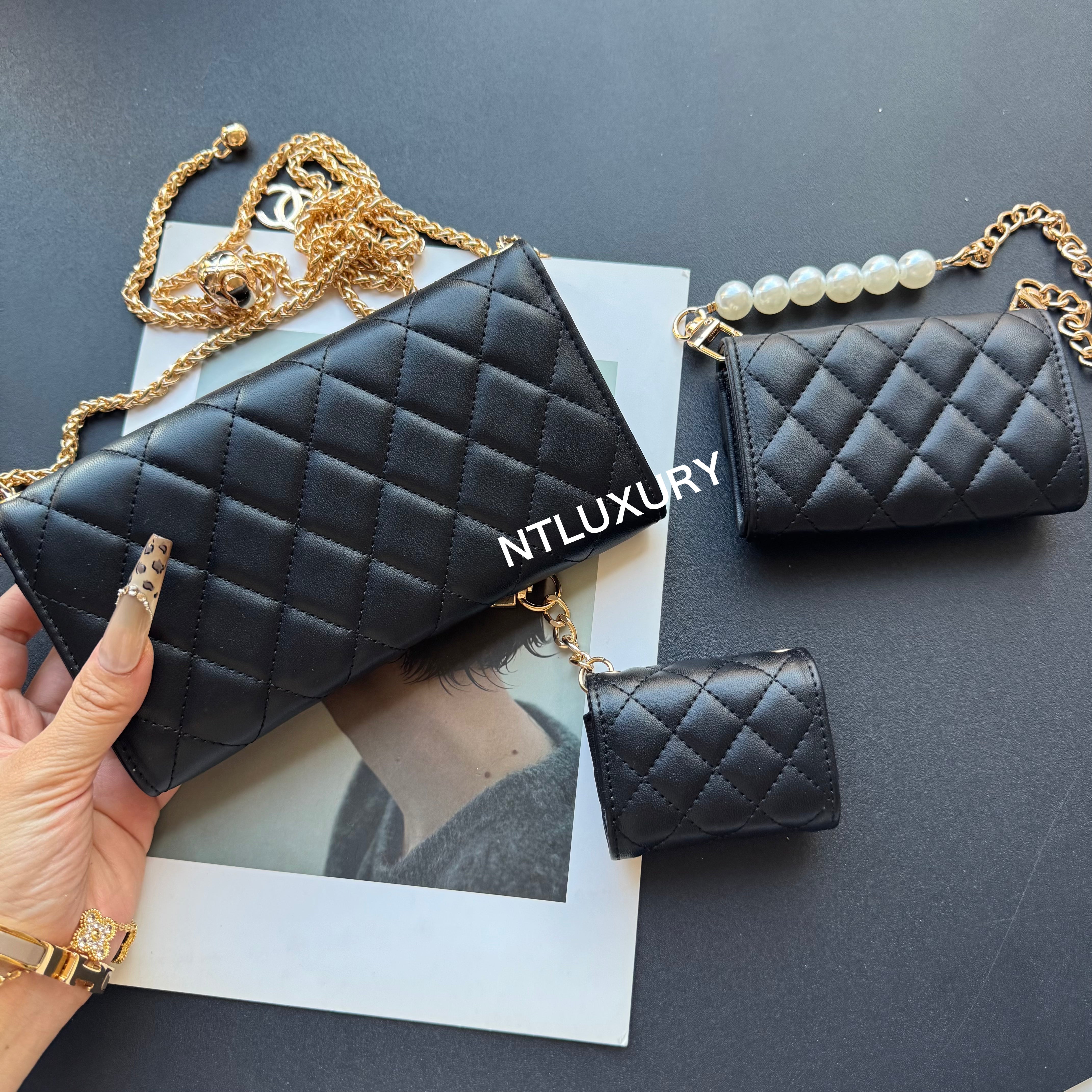 With dimensions of 115mm x 72mm, the medium bag features an elegant short chain adorned with a pearl, adding a touch of sophistication. It functions ideally as a compact card holder, conveniently storing cards, IDs, and even some small accessories. Its chic design makes it suitable for both casual and formal occasions.