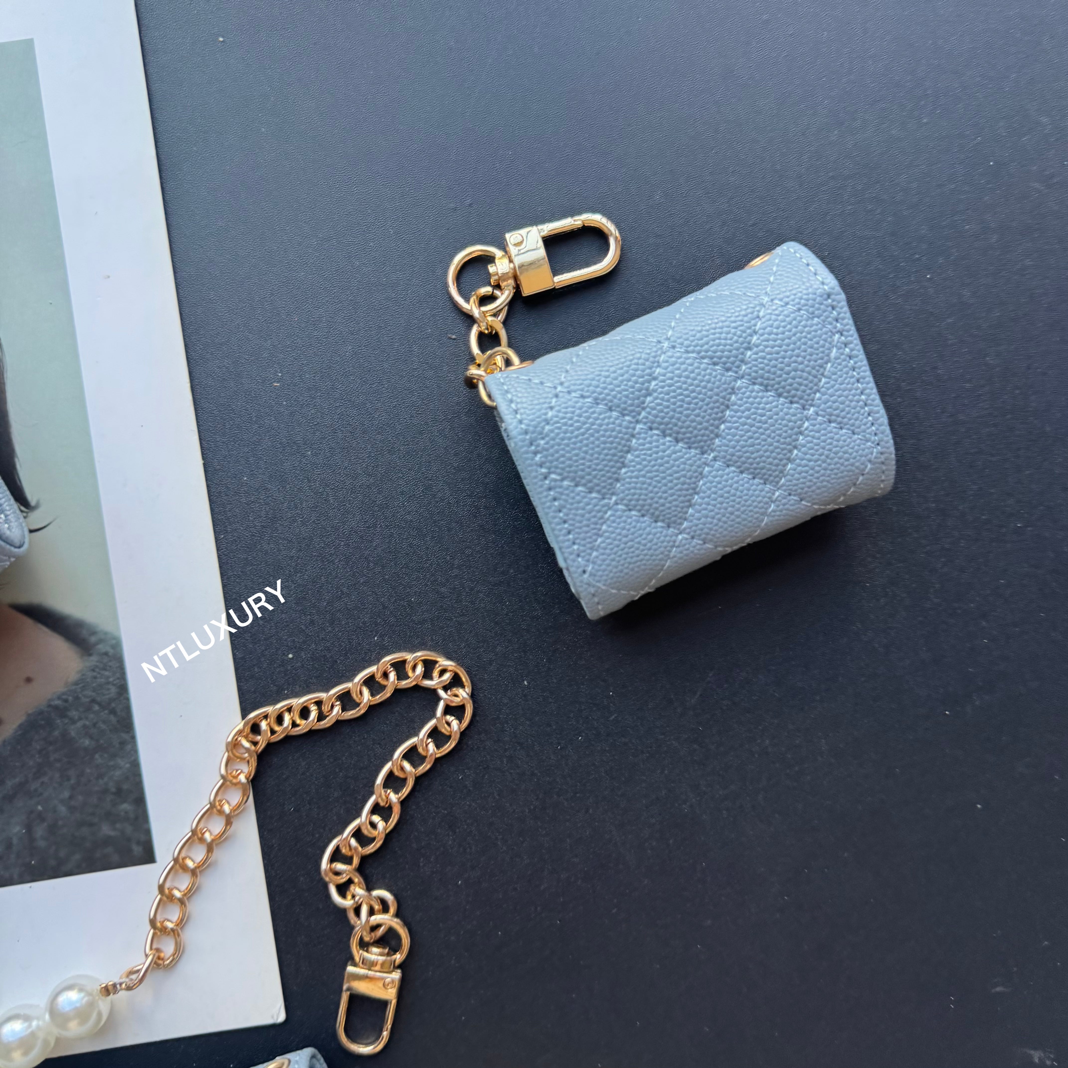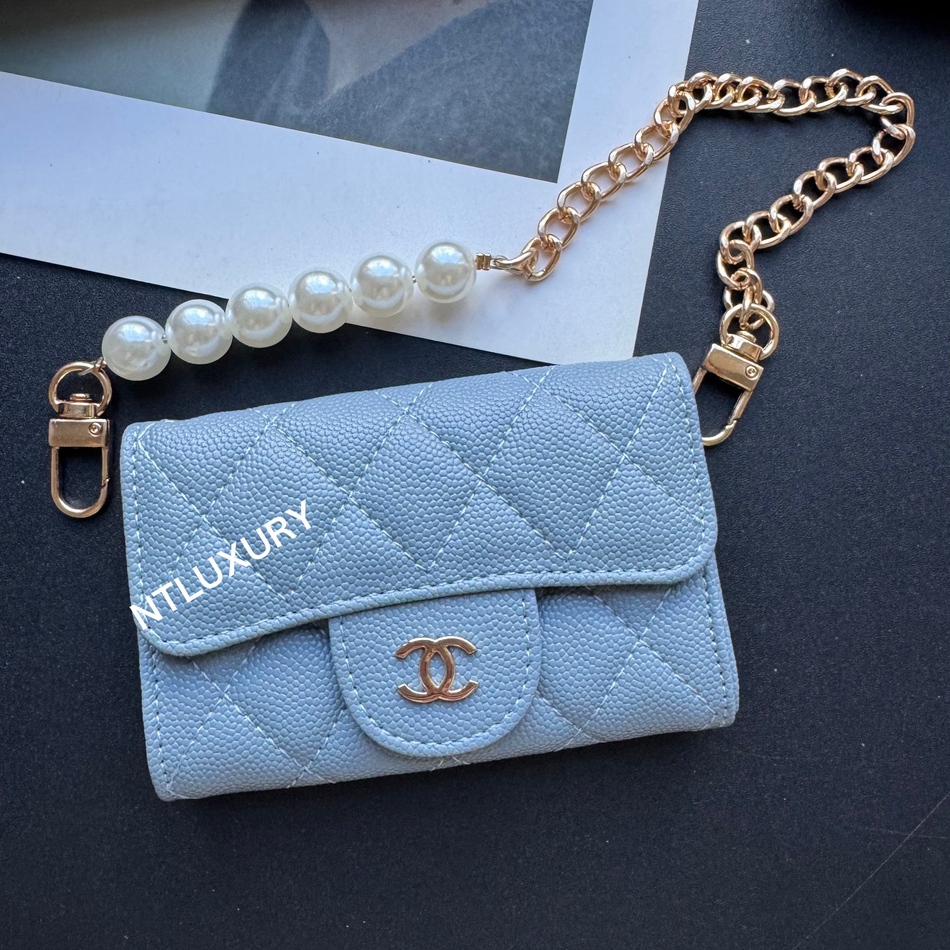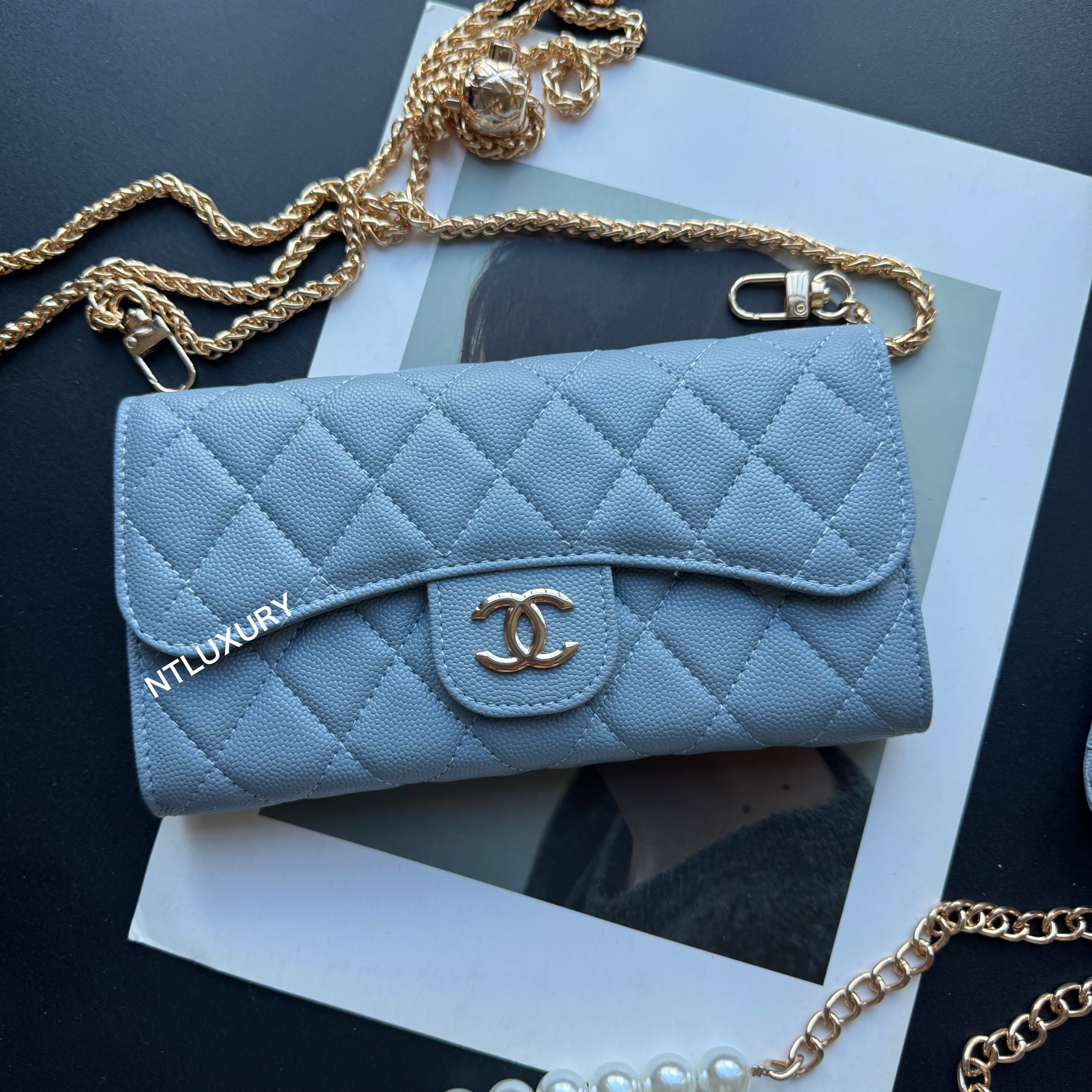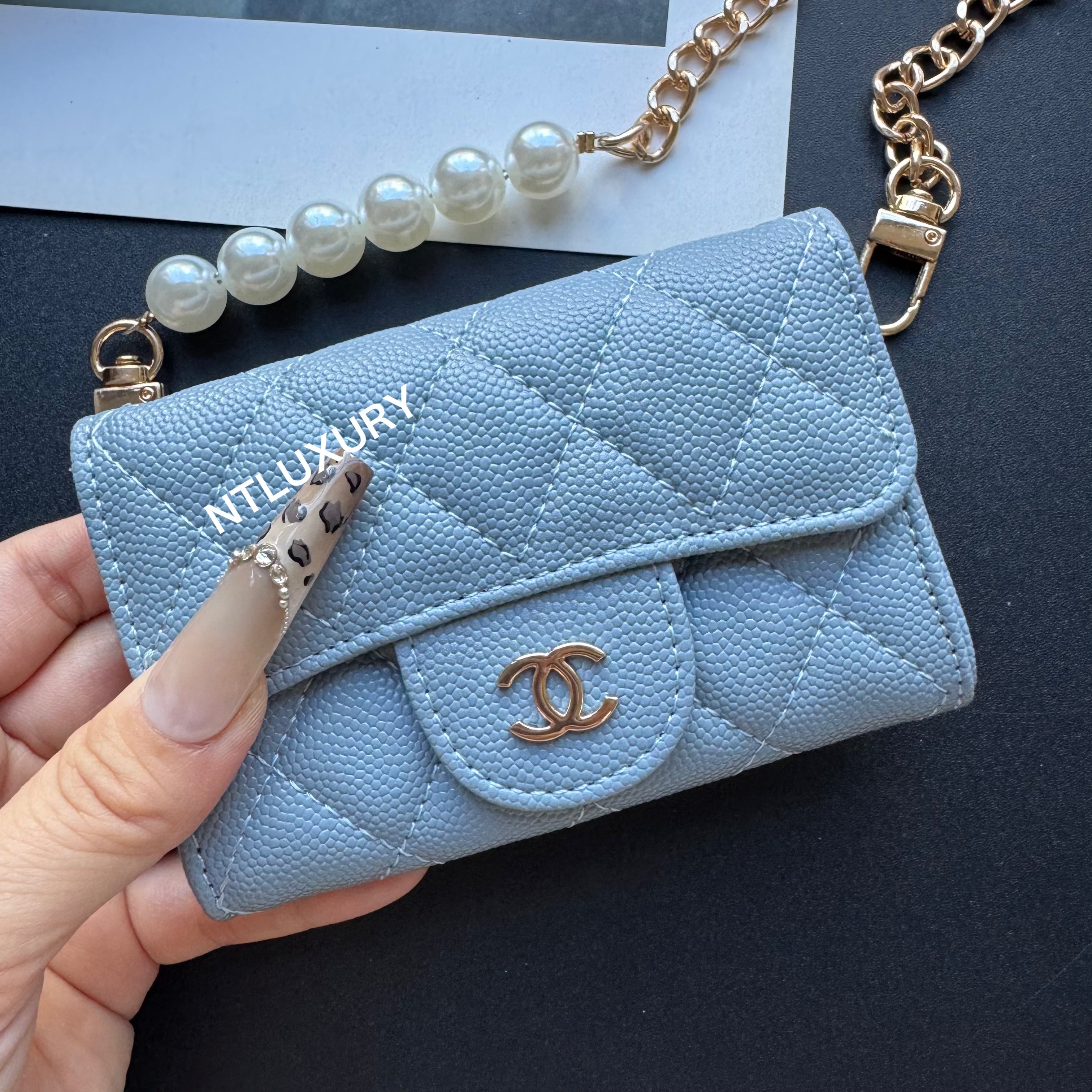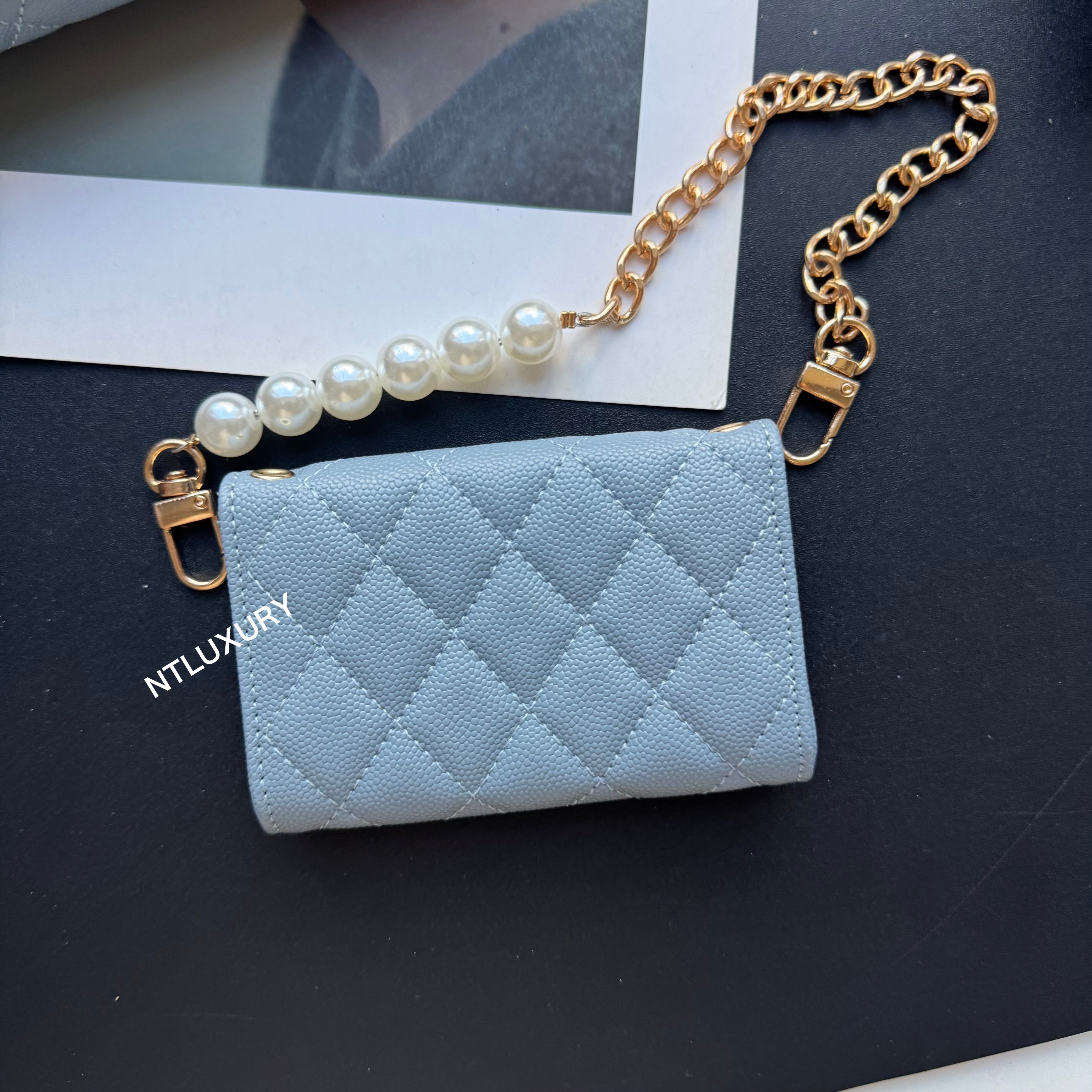 With dimensions of 115mm x 72mm, the medium bag features an elegant short chain adorned with a pearl, adding a touch of sophistication. It functions ideally as a compact card holder, conveniently storing cards, IDs, and even some small accessories. Its chic design makes it suitable for both casual and formal occasions.
