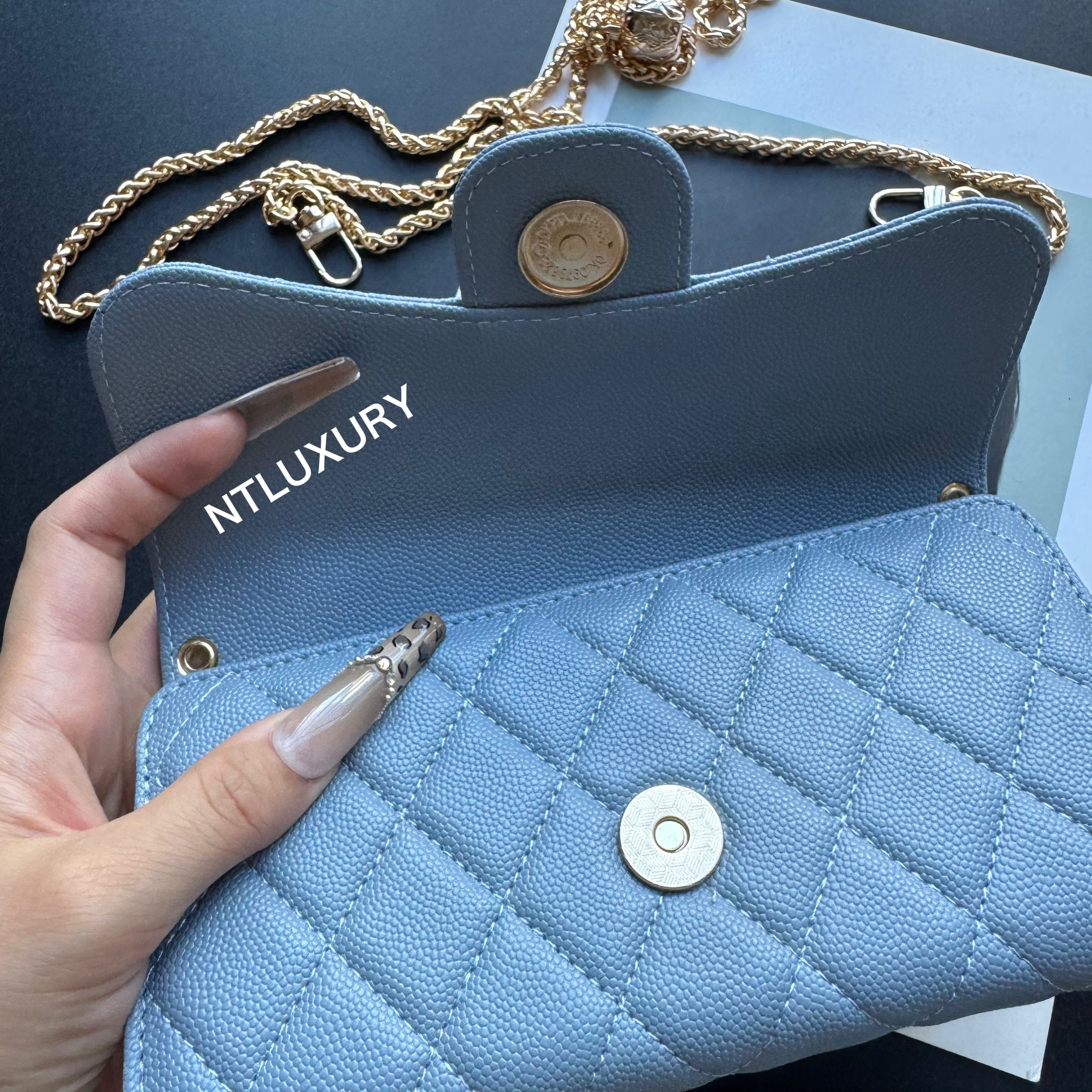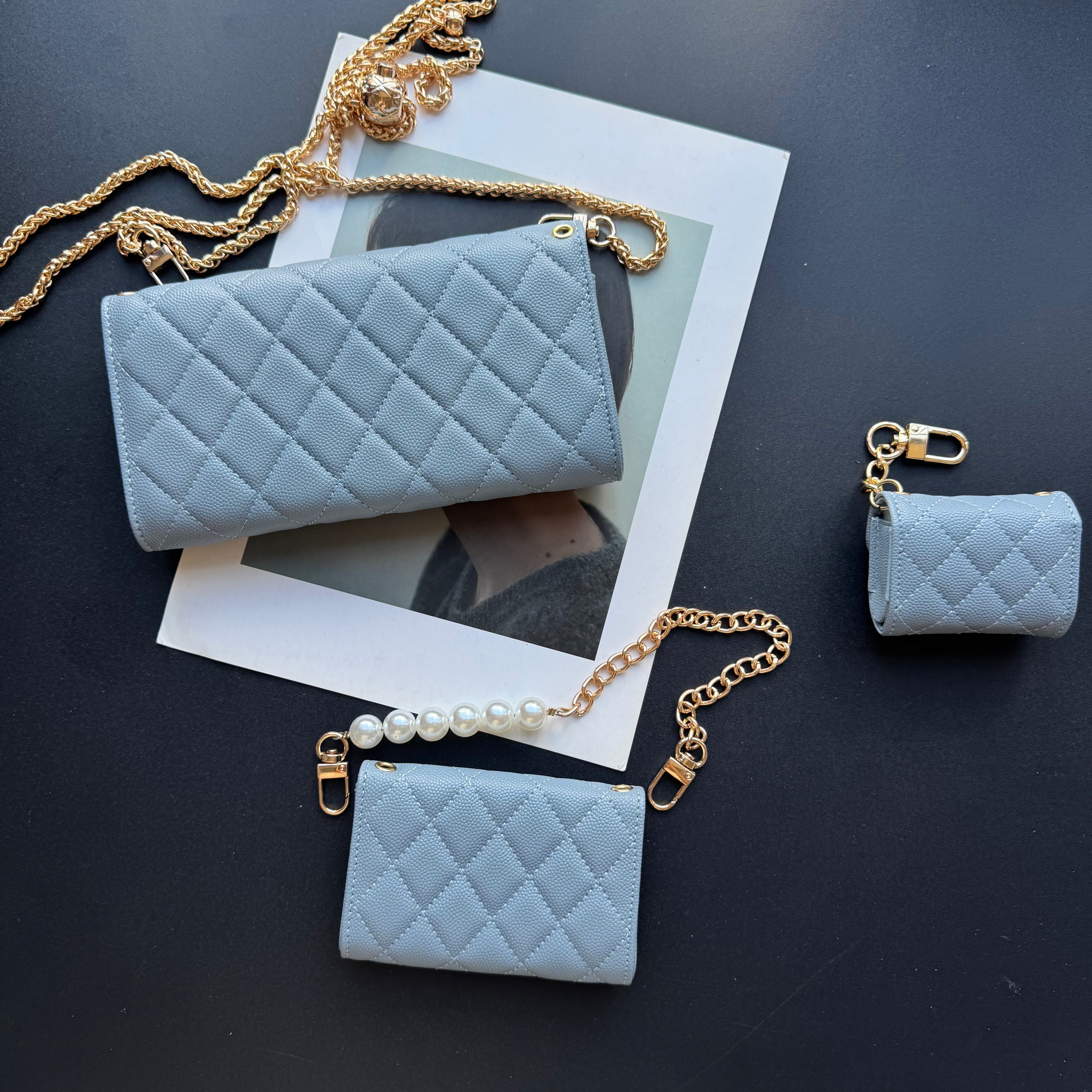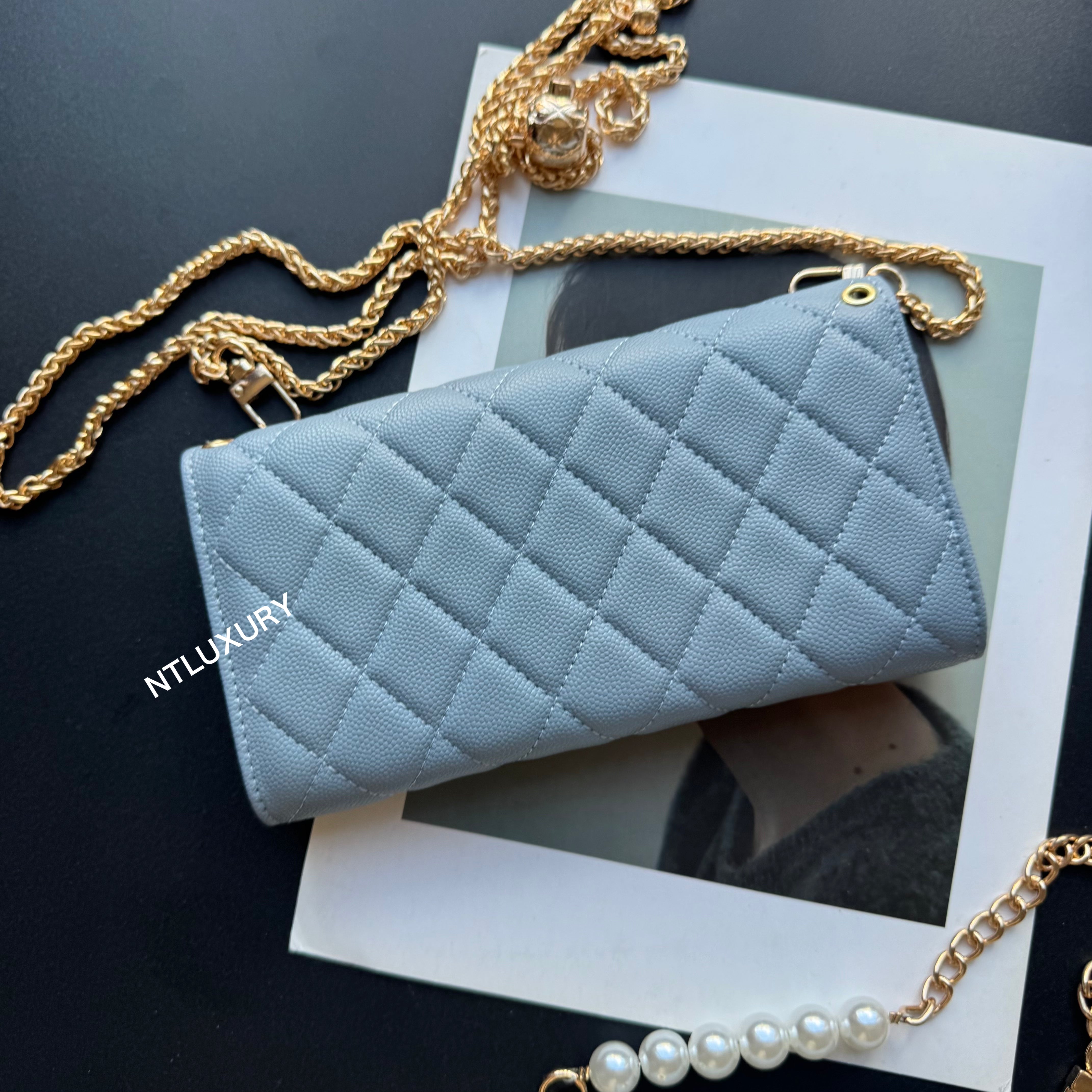 Measuring 190mm x 105mm, the large bag comes with an adjustable long chain strap, making it versatile for both handheld and shoulder carry. Its spacious interior is perfectly sized to hold a smartphone, multiple cards, a lipstick, and other daily essentials, offering both practicality and style for everyday use.