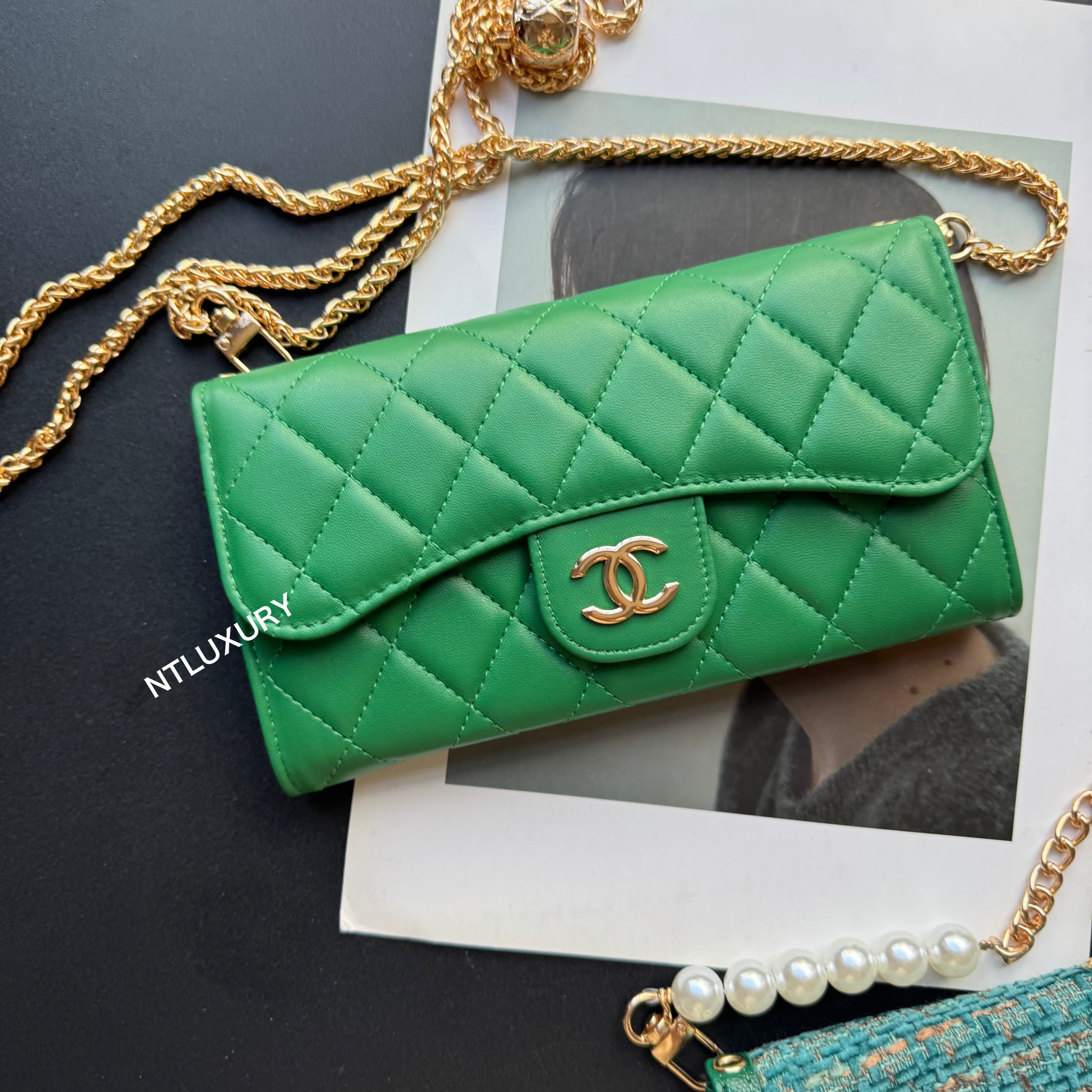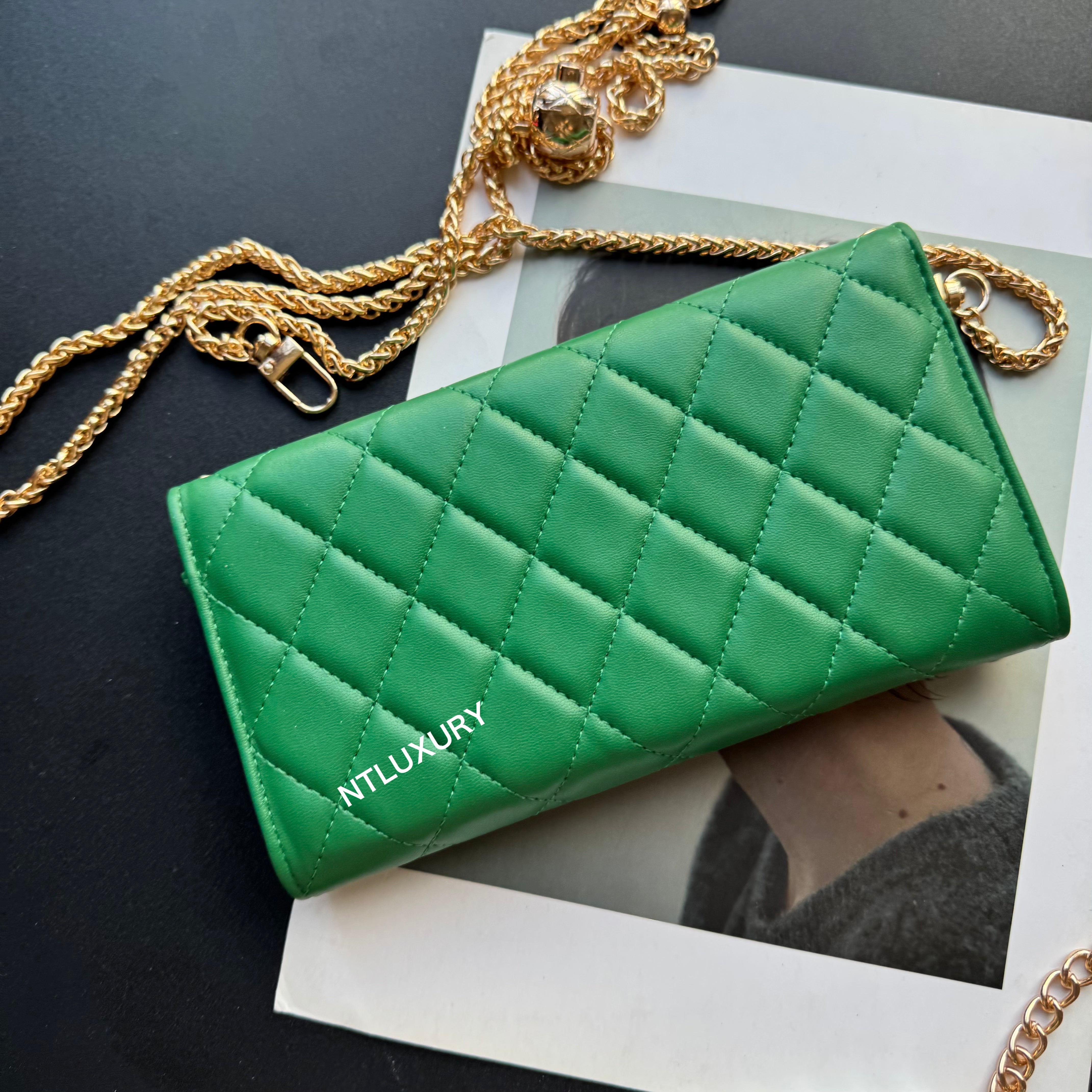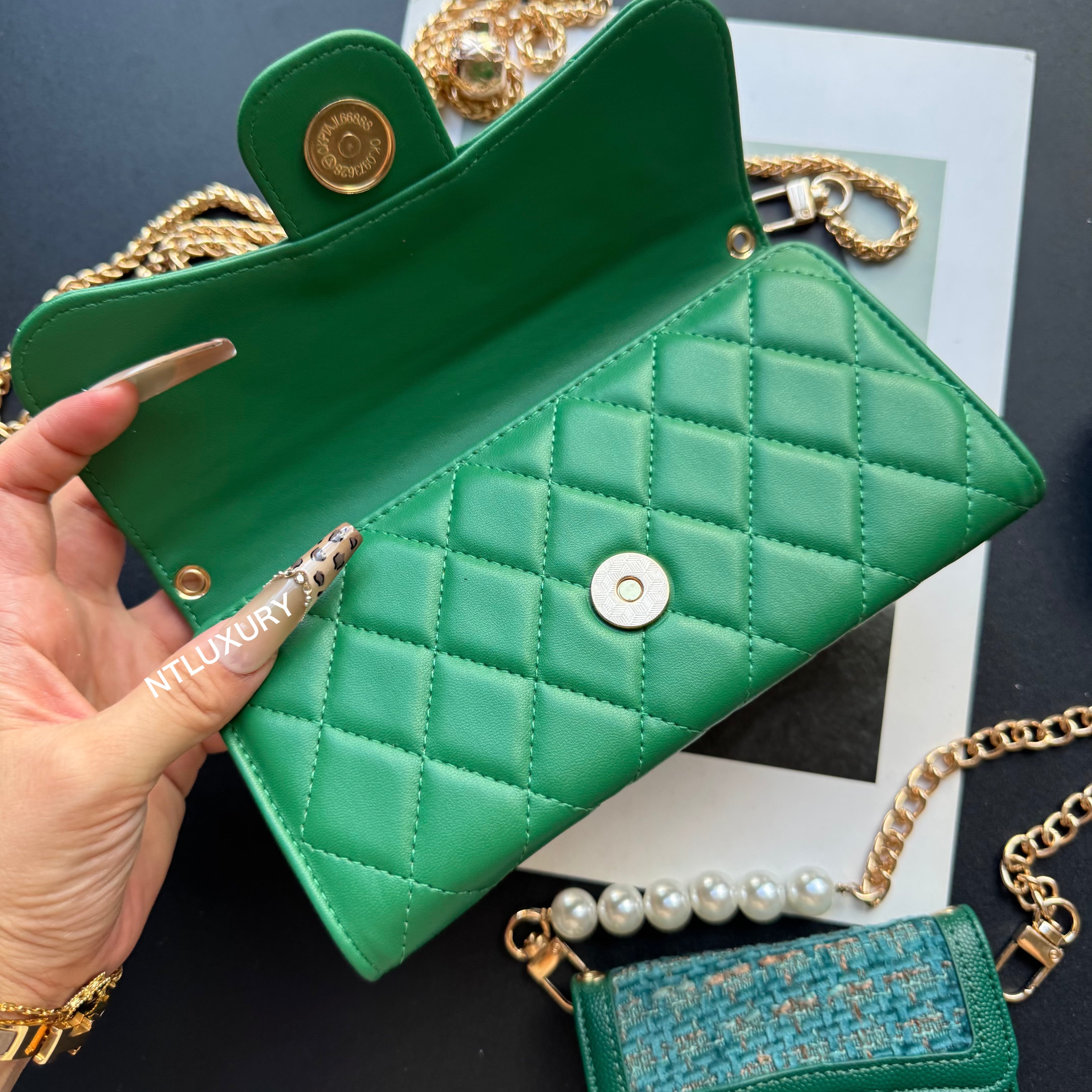 Measuring 190mm x 105mm, the large bag comes with an adjustable long chain strap, making it versatile for both handheld and shoulder carry. Its spacious interior is perfectly sized to hold a smartphone, multiple cards, a lipstick, and other daily essentials, offering both practicality and style for everyday use.